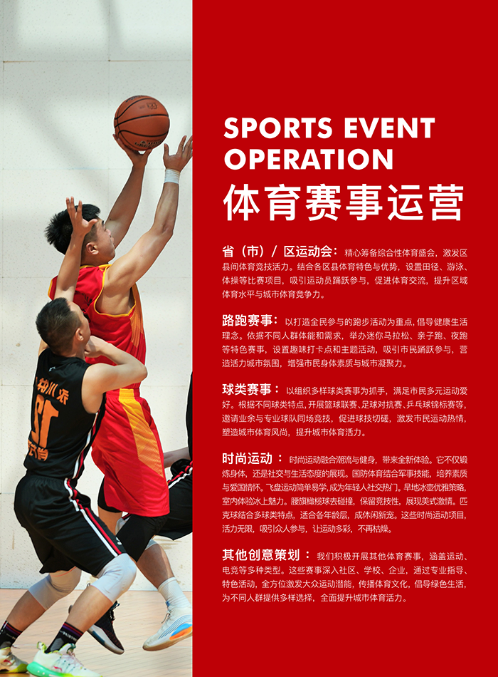 在健康中國(guó)戰(zhàn)略指引下,全?健?熱情不斷?漲 。動(dòng)也開展各類?拉松、?徑運(yùn)動(dòng)會(huì)、球類賽事,?上運(yùn)動(dòng)會(huì)、體操?賽、拔河?賽等,?有賽事IP“愛定向”“四分?”“奔跑江蘇”“中國(guó)?三?四分?”“夢(mèng)之藍(lán)·冰壺挑戰(zhàn)賽”等,展現(xiàn)??群眾敢于拼搏、積極奮?的精神?貌,增強(qiáng)政企事業(yè)單位的活?和競(jìng)爭(zhēng)?,為其在新時(shí)代的發(fā)展提供更加?闊的空間。